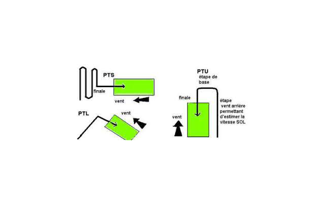 Reprenons. Après le décollage, lors d'un simple vol de descente du Ménez (70 à 80 m), vous virez et êtes déjà en étape de base comme dans la PTL. Un second virage et vous vous alignez face au vent c'est à dire que vous êtes en finale.