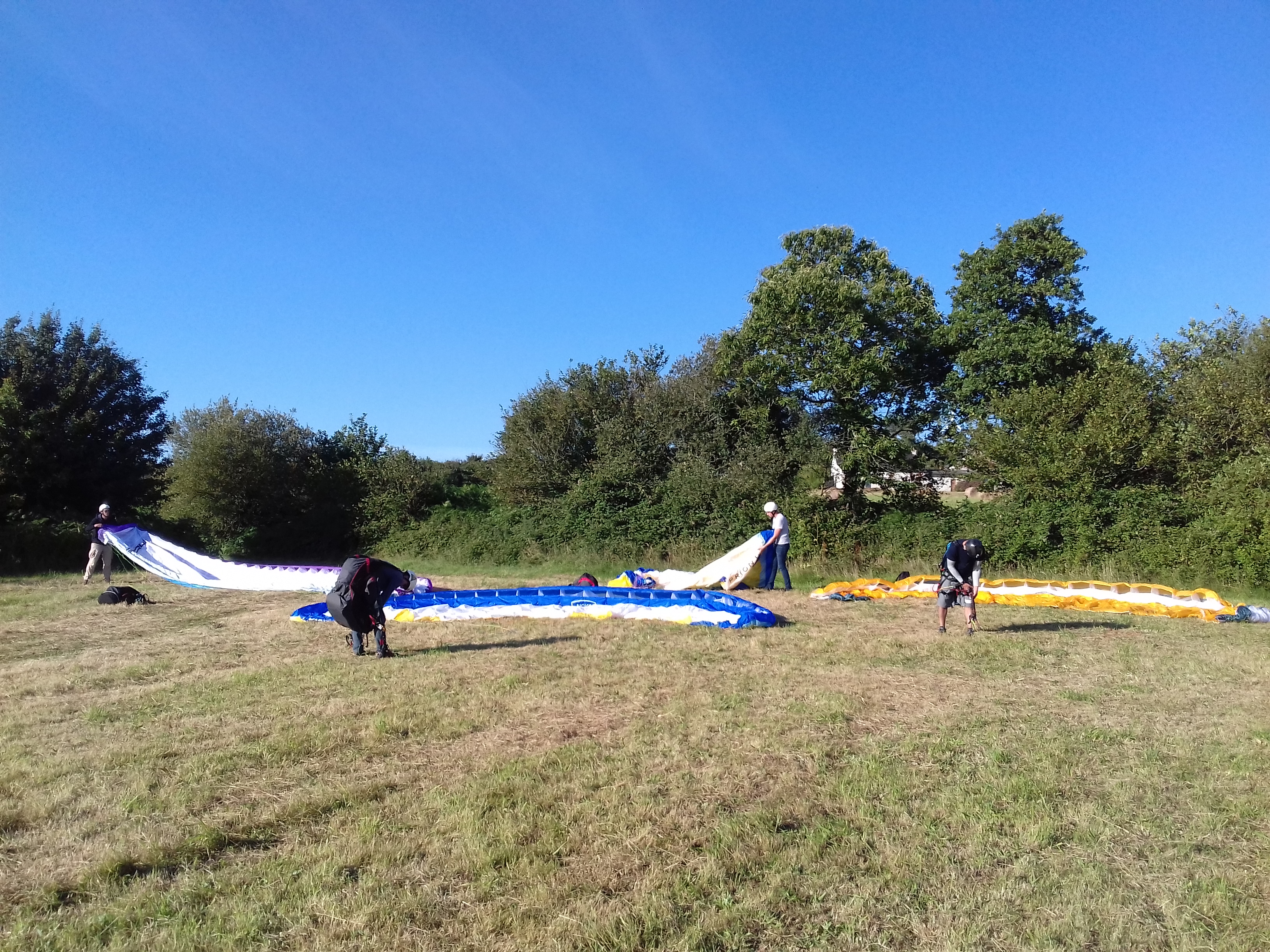 Journée idéale : léger vent de nord, ou de nord ouest. J'explique, chacun dispose sa voile au sol, démêle, essaie de gonfler, court avec la voile, et fait tomber la voile sans avoir volé. On se rapproche du décollage, le vent est toujours là, on se positionne, on court, on décolle, on vole, et on se pose. On recommence.